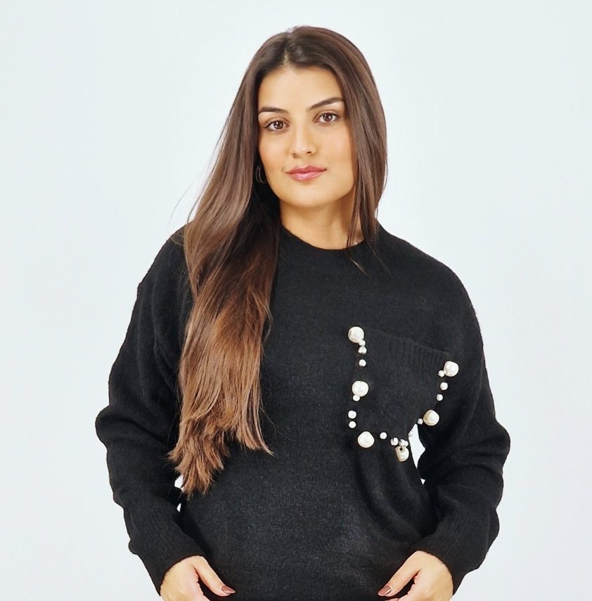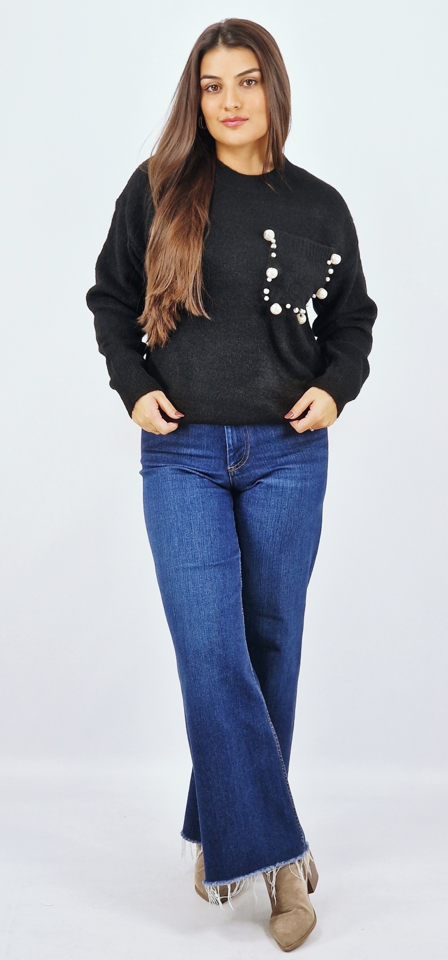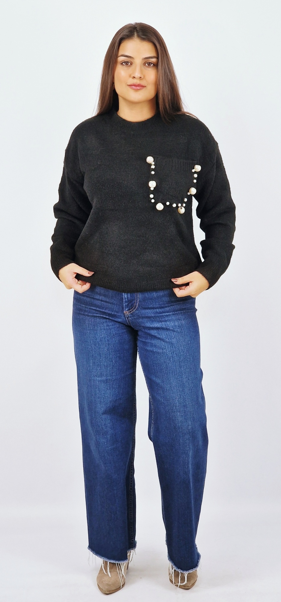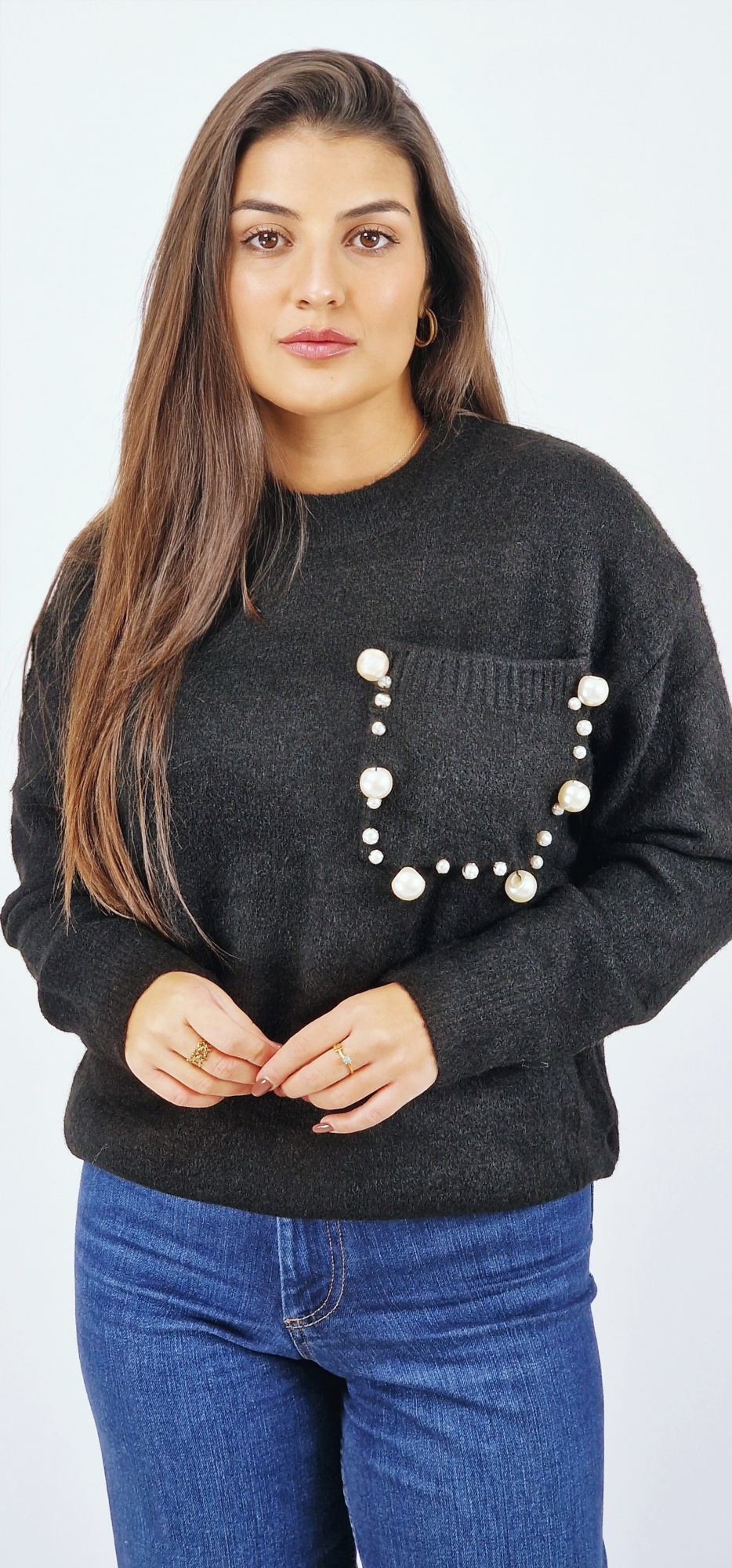 -Bolsos frontal com aplicações de pérolas;