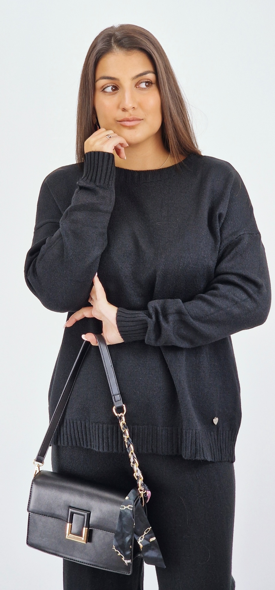 -Camisola: Corte oversized, decote redondo, punhos e bainha canelados;