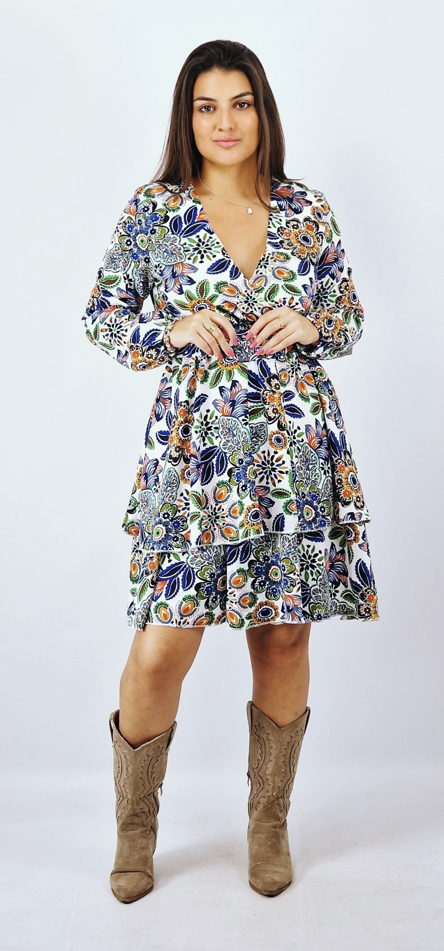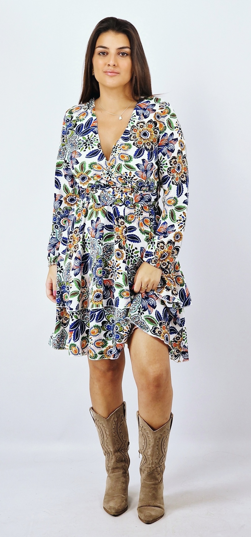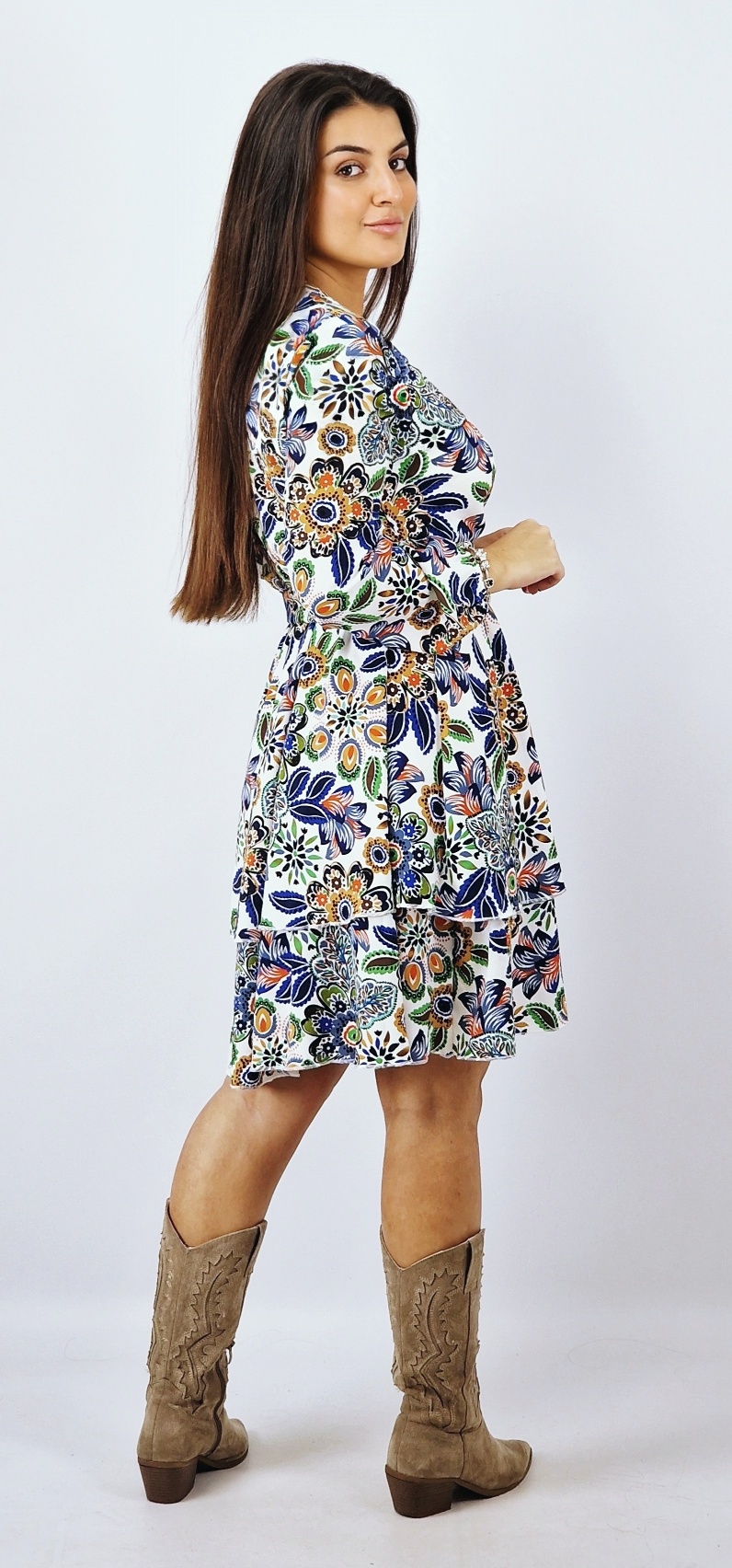 Este vestido curto apresenta estampa floral vibrante em tons de azul, verde e laranja sobre fundo branco.